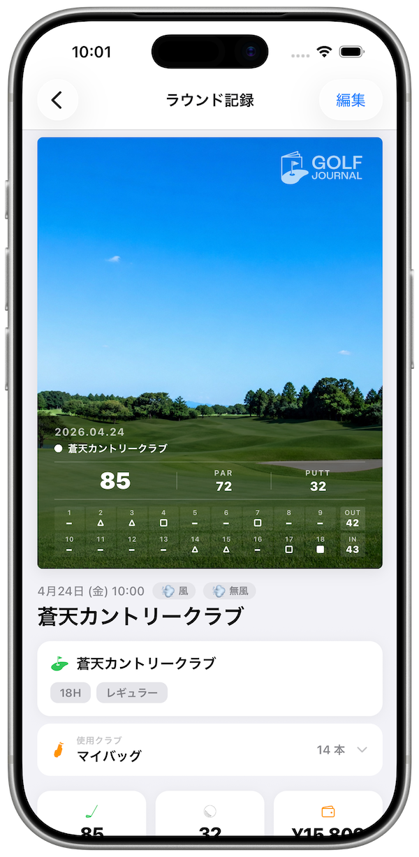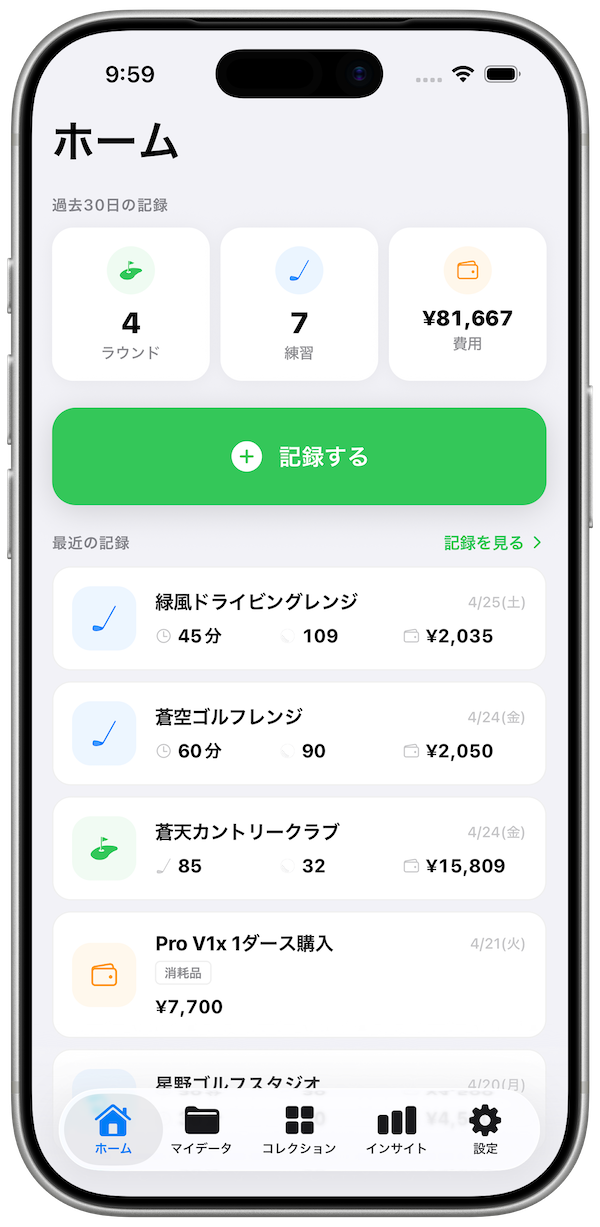 数タップでスコアや練習量を入力。あとから写真や費用も追加できます。