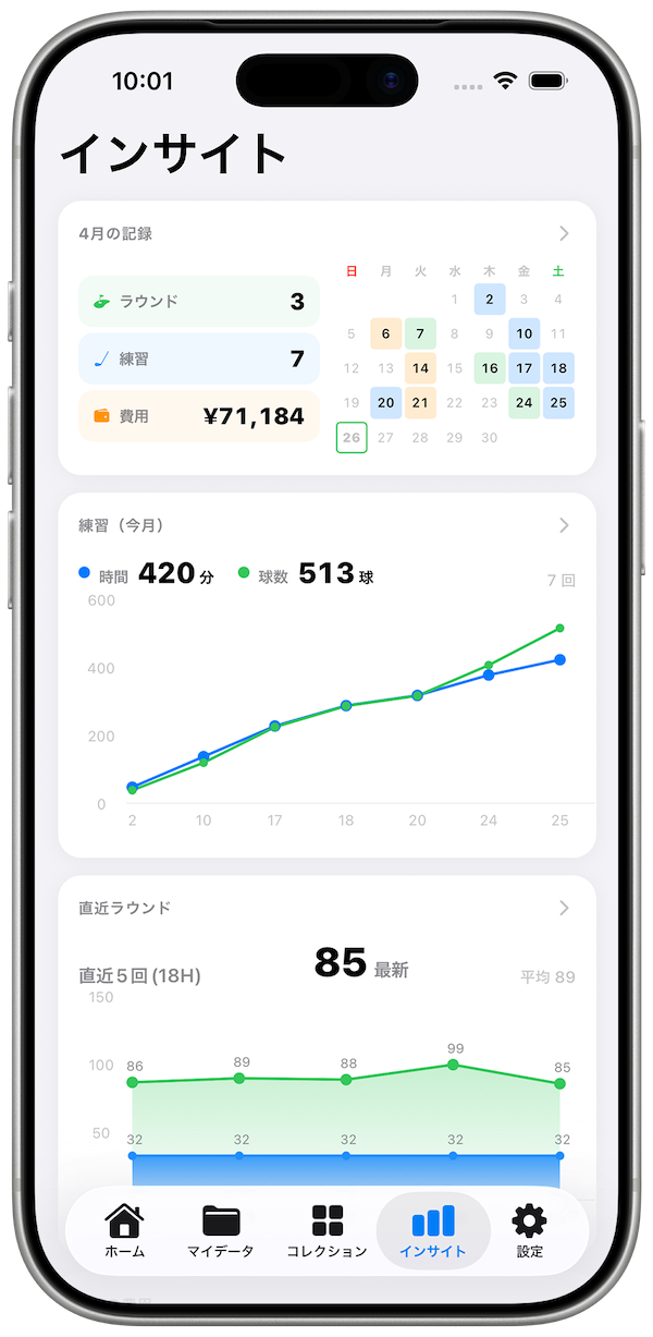 はい。ラウンド・練習・費用の記録、月ごとのインサイトなど主要な機能はすべて無料でお使いいただけます。